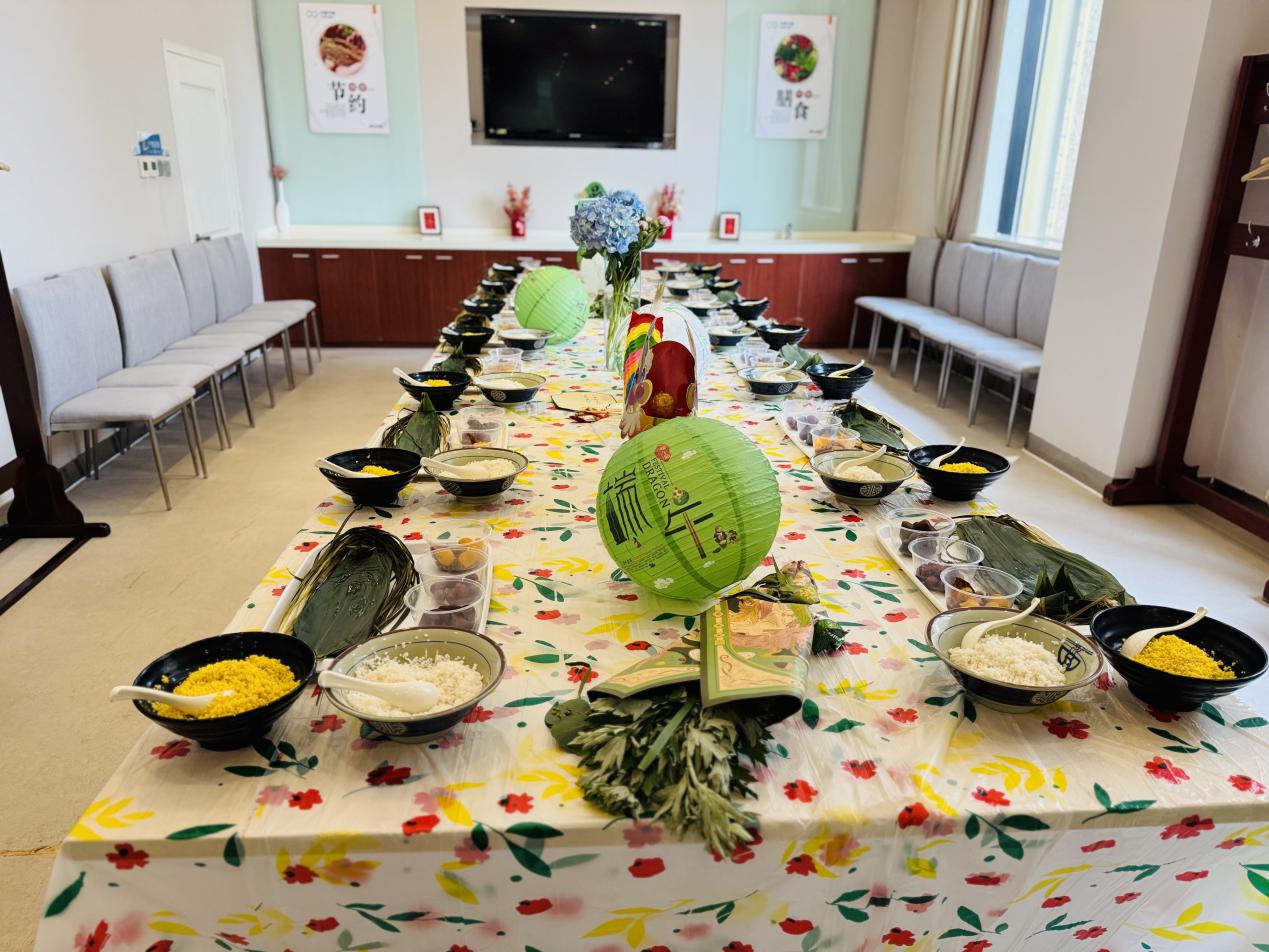 現場準備了糯米、藜麥、大黃米、粽葉、馬蓮草、蜜棗、豆沙、五花肉、蛋黃等材料。包粽子的過程中,從挑選粽葉、浸泡糯米,到包裹成型,每一個步驟都充滿樂趣。技術嫻熟的人不用一分鐘就可包好一個完美的四角粽,而現學的人則相對手拙,不斷嘗試、不斷學習,互教互學,大家都十分享受包粽子的過程,在笑聲中為職工包粽子,歡度端午,同時也在包粽子的過程中感受到大家庭的濃濃暖意。