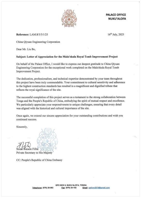 近日,由中國節能所屬中國啟源承擔設計和管理任務的援湯加王陵外圍區域改造項目進入竣工驗收階段。湯加國王秘書兼王宮辦公室主任、湯加副首相兼基礎設施部大臣先后代表湯加政府致信中國啟源,對項目管理團隊給予高度評價和肯定。