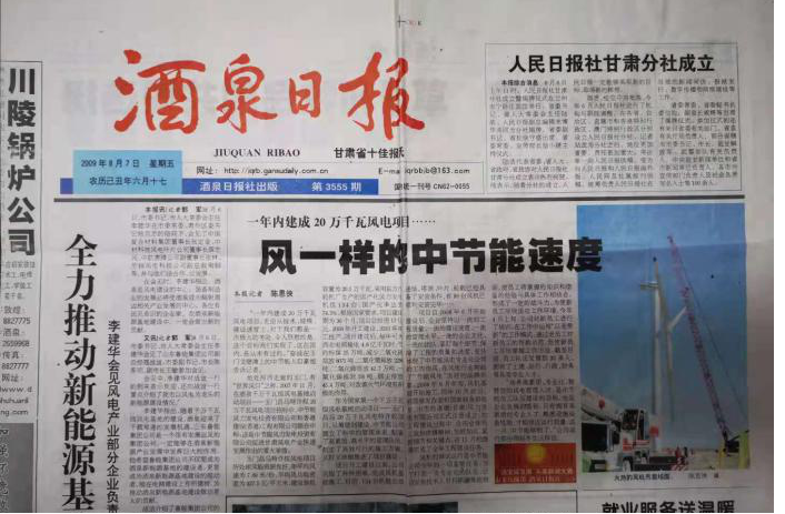 2009年8月8日,是個(gè)值得所有中國(guó)風(fēng)電人銘記的莊嚴(yán)時(shí)刻,承載著建設(shè)“陸上三峽”和甘肅千萬千瓦風(fēng)電基地的希望工程,在中國(guó)節(jié)能中標(biāo)的國(guó)家首個(gè)千萬千瓦風(fēng)電基地啟動(dòng)項(xiàng)目甘肅酒泉風(fēng)電基地玉門昌馬風(fēng)電場(chǎng)20萬千瓦風(fēng)電特許權(quán)項(xiàng)目現(xiàn)場(chǎng)舉行一期工程啟動(dòng)儀式。時(shí)任國(guó)家能源局局長(zhǎng)張寶國(guó)、甘肅省委書記陸浩、甘肅省長(zhǎng)徐守盛以及中國(guó)節(jié)能黨委書記陳津恩等領(lǐng)導(dǎo)出席儀式。自此中國(guó)開啟了大規(guī)模建設(shè)風(fēng)電項(xiàng)目的序章,開啟了建設(shè)“陸上三峽”浩大工程。