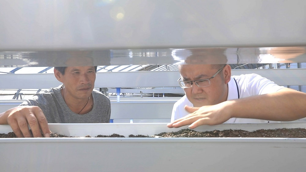 王文濤帶著村里致富能手,一起查看水果大棚果苗情況