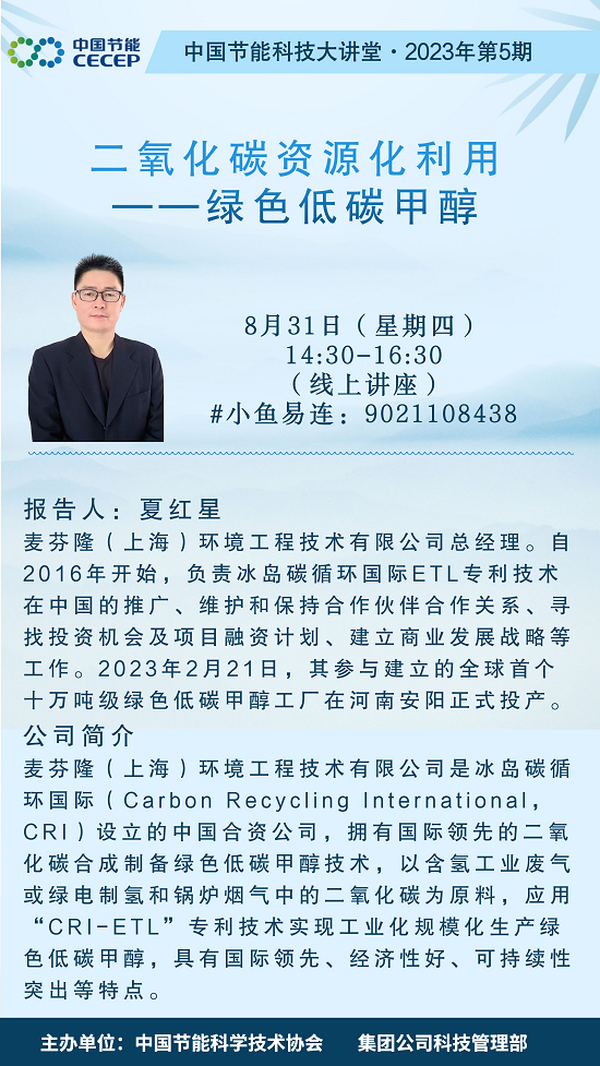 為加強綠色低碳技術(shù)交流,促進戰(zhàn)略性新興領(lǐng)域和行業(yè)前沿領(lǐng)域產(chǎn)業(yè)技術(shù)合作,集團公司科技管理部、中國節(jié)能科協(xié)特邀請麥芬隆(上海)環(huán)境工程技術(shù)有限公司(以下簡稱麥芬隆公司)總經(jīng)理夏紅星先生于2023年8月31日作科技大講堂專題講座。現(xiàn)將有關(guān)事項通知如下:
