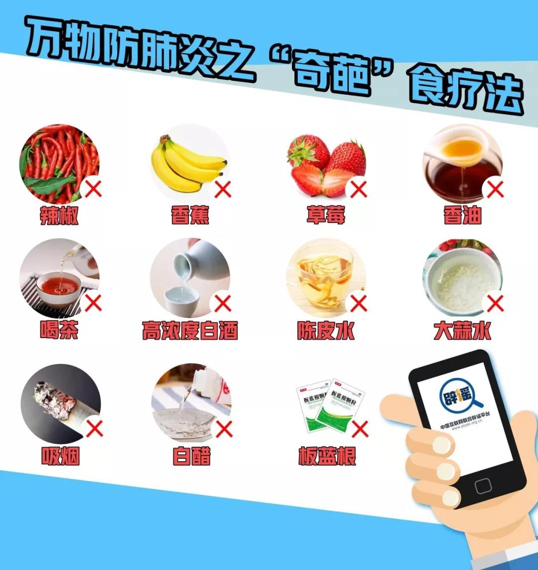 2020年的春節(jié) 一場新型冠狀病毒感染的肺炎 “來勢洶洶” 各類消息鋪天蓋地 一面是全民“戰(zhàn)疫”捷報頻傳 穩(wěn)定人心 一面是偽科學、疫情謠言反復翻炒 乘虛而入 慧眼識謠,理性防疫 請看 《鑒謠手冊:“新型冠狀病毒感染的肺炎”謠言的六大套路》 套路一:“萬物治肺炎:吃XXX可防止冠狀病毒肺炎” 流傳版本:吃辣椒、香蕉、草莓、大蒜、喝茶、酒、陳皮水、大蒜水等。流傳中多借用“鐘南山建議”或是某位營養(yǎng)專家、權威媒體等名號。
